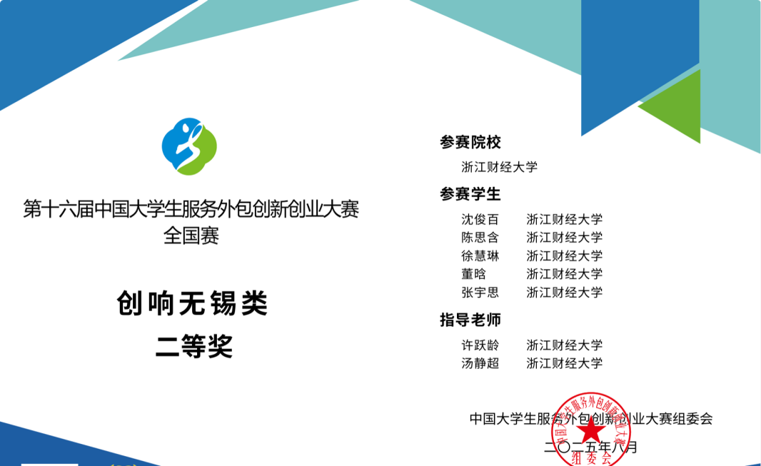近日,由教育部、商务部和无锡市人民政府共同主办的第十六届中国大学生服务外包创新创业大赛全国总决赛圆满落幕。我院参赛团队项目《智金视界——中国传统黄金企业数字化转型的开拓者》在创响无锡类赛道中表现出色,斩获全国二等奖!刷新学院在该赛事全国总决赛中的历史最佳成绩。