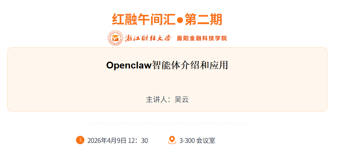 2026 年 4 月 9 日,盈阳金融科技学院本学期党建系列品牌活动 “红融午间汇・第二期” 如期举办。本次活动围绕OpenClaw 智能体的介绍与应用开展专题汇报与交流,学院师生代表齐聚一堂,共话前沿技术,共促科研与教学深度融合。
