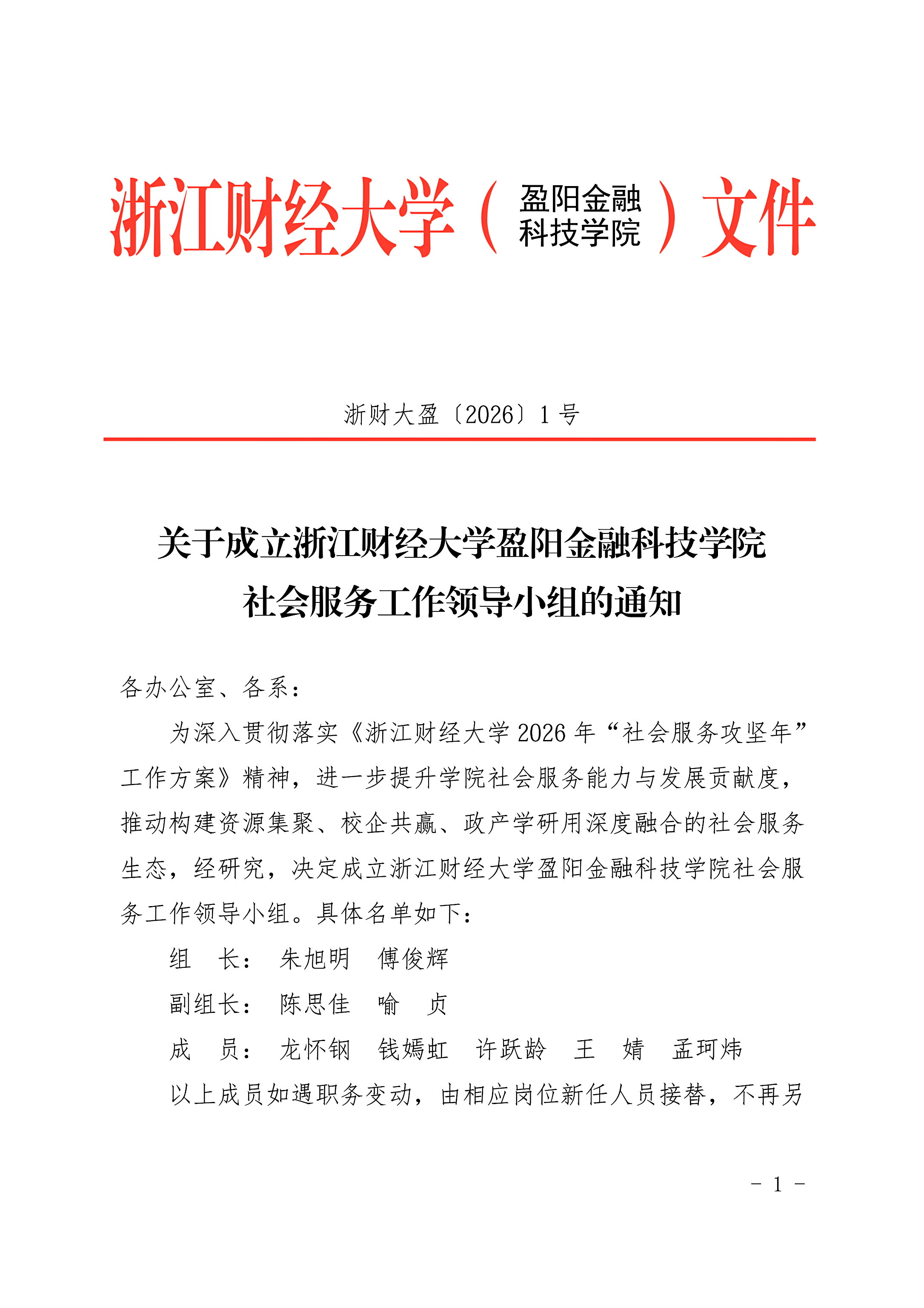 关于成立浙江财经大学盈阳金融科技学院社会服务工作领导小组的通知